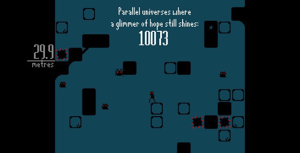 The upgrades are a strong part of what make the game so special, but they’re far from the only thing it has going for it. The title of the game references the constant onscreen text that rapidly estimate your chance of survival. They start off quite positive, “Futures where all is not lost: 328398” but begin to decrease the likelihood of your survival as you take damage. If you’ve taken a substantial amount of damage, the text will eventually read “Chances you will ever see your family again: 2” which means you can take one more hit before you’re dead. Dying will result in a “Probability 0” of your chance to escape the pit.
